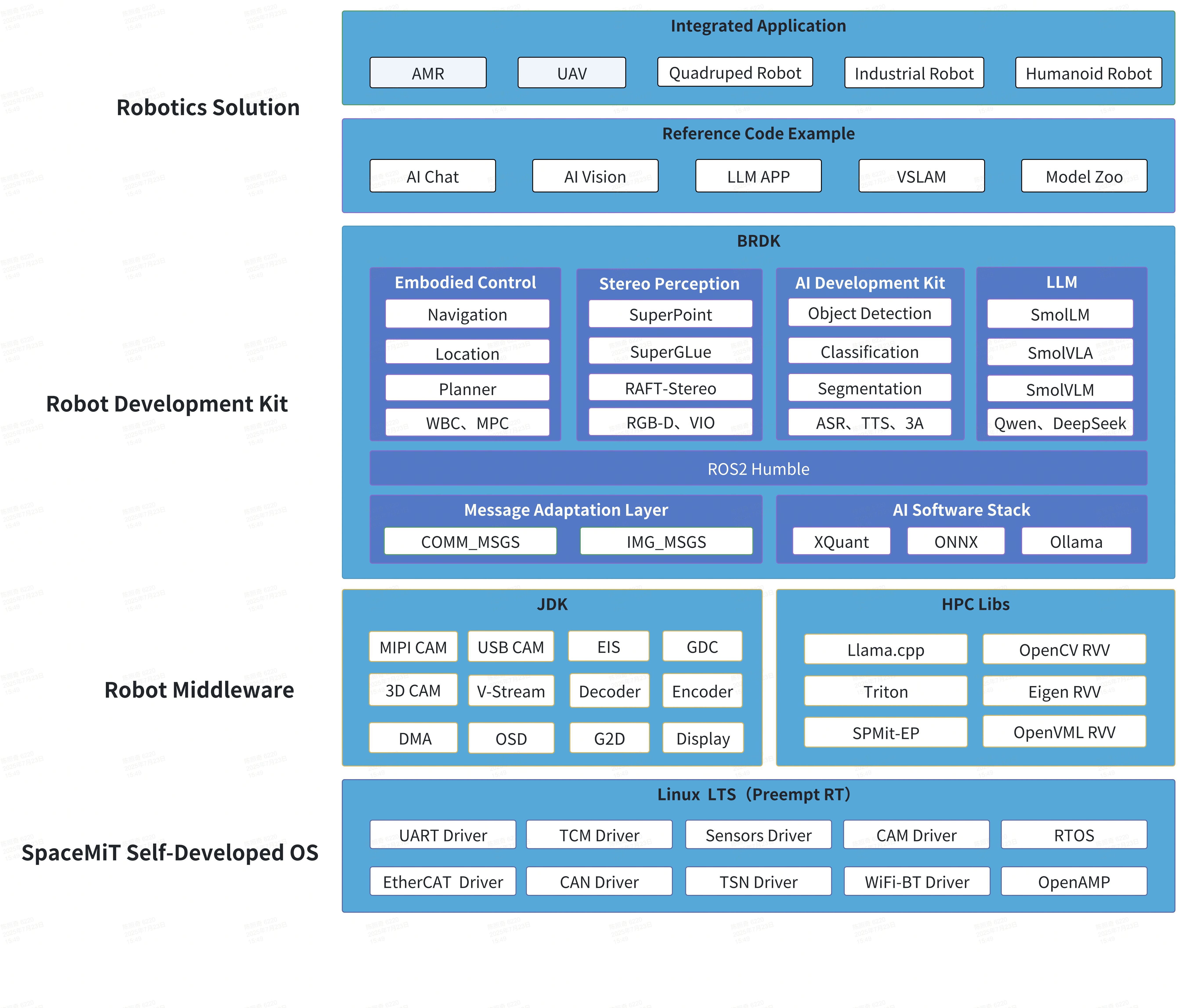 The core system Bianbu ROS is built upon the self-developed Bianbu OS as the kernel and uses ROS2 as the runtime core. It integrates multimedia middleware JDK, high-performance computing libraries HPC Libs, and a development kit BRDK, forming a complete robotic application infrastructure. The system comes with built-in AI models and toolchains, supporting commonly used modules and sample references such as speech recognition, vision perception, task orchestration, and path planning — ready to use out of the box.