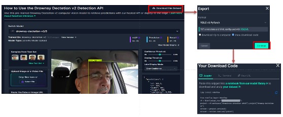 dataset = version.download("yolov5pytorch")此步骤,请先到 roboflow 网站的 drownsy-dectetion-v2 ,依照下图操作去的相应的 API Key 。