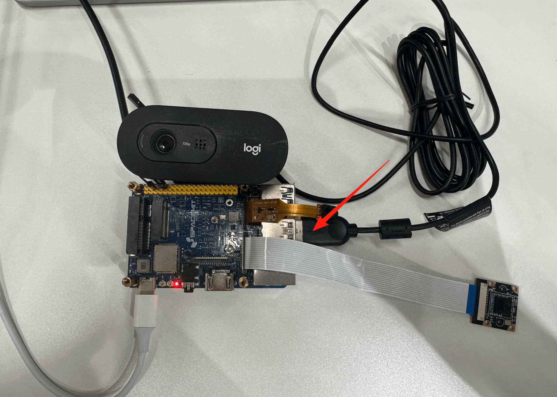 请 将 USB 摄像头模组连接至开发板的 USB 接口,如下图所示: