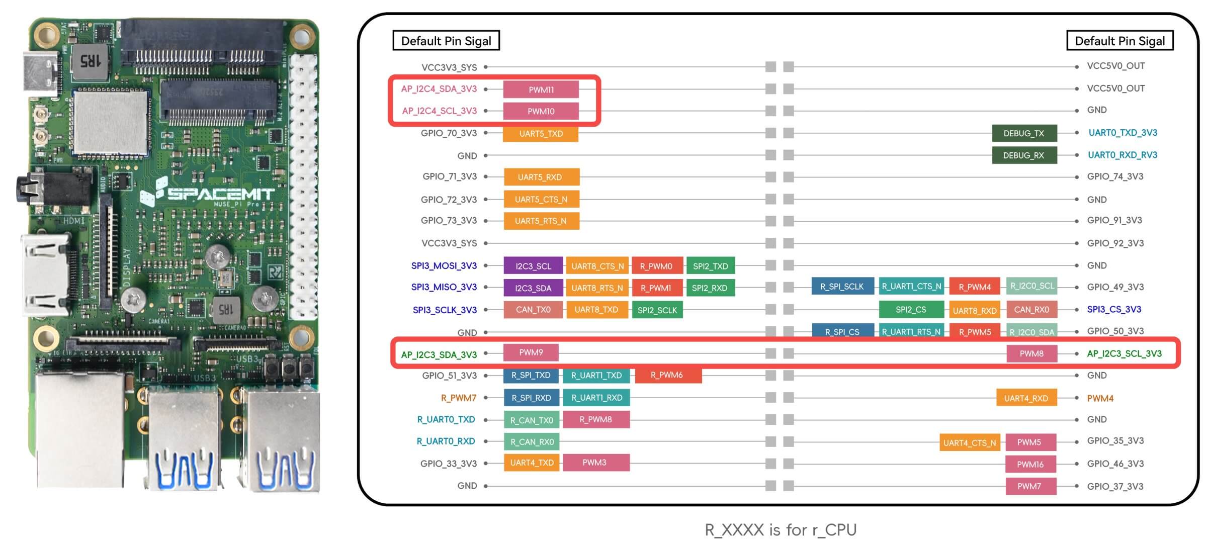 以 MUSE Pi Pro 为例,支持 I2C 的引脚示意图如下: