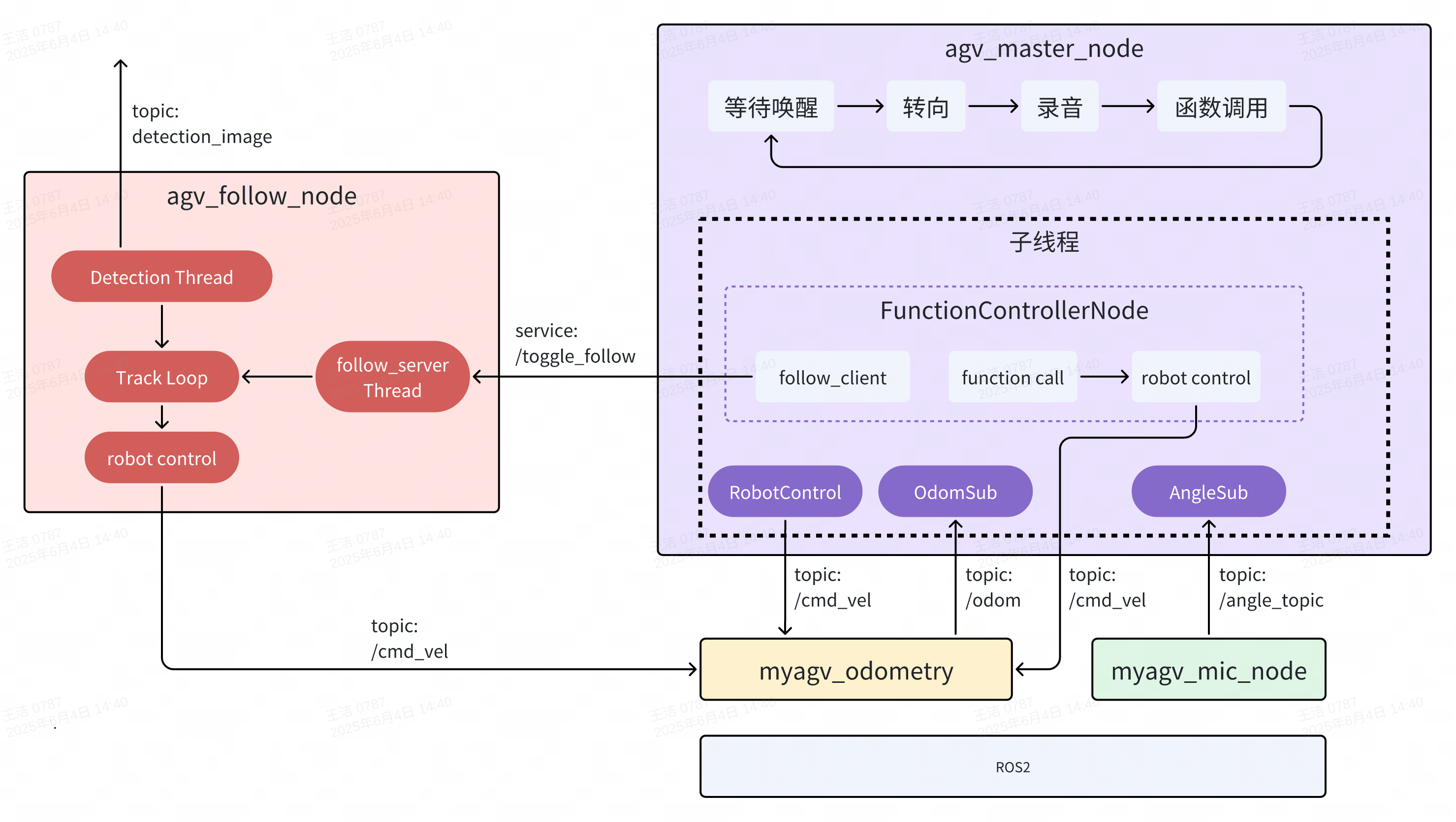 上图展示了 AGV 小车跟随案例在 ROS2 系统中的整体框架与流程控制,主要由以下四个节点组成: