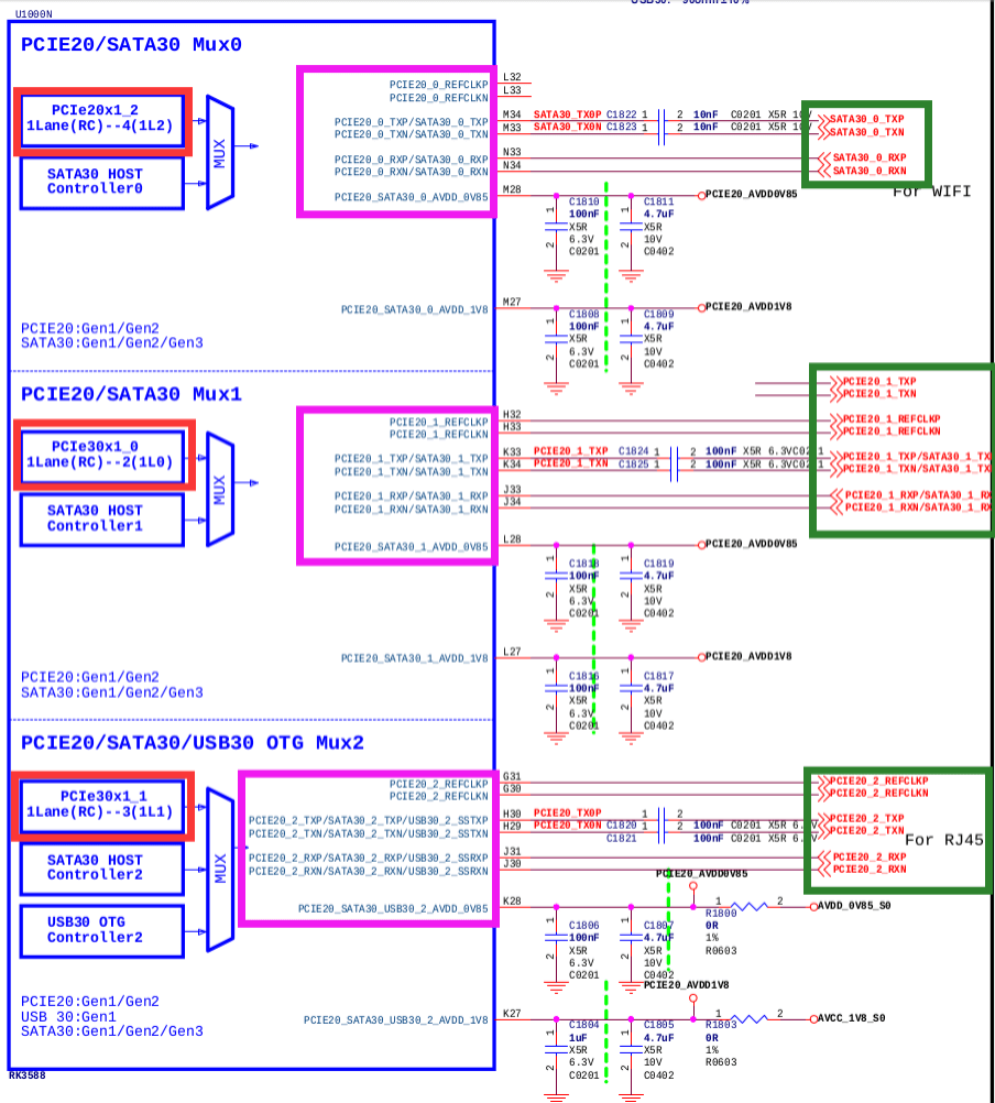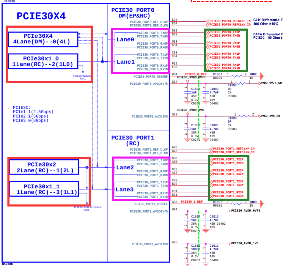 pcie30phy | phy@fee80000 | External | 4Lane: PHY_MODE_PCIE_AGGREGATION 2Lane+2Lane: PHY_MODE_PCIE_NANBNB 2Lane+1Lane+1Lane: PHY_MODE_PCIE_NANBBI 1Lane4: PHY_MODE_PCIE_NABIBI | PCIe dedicated |