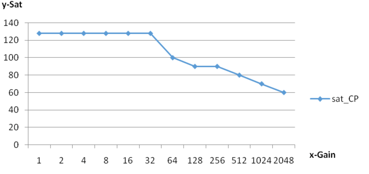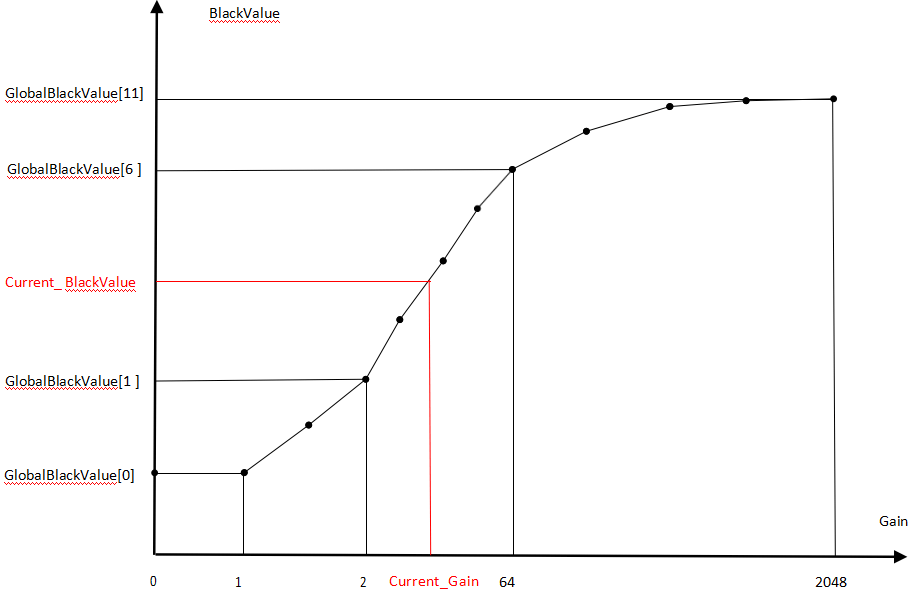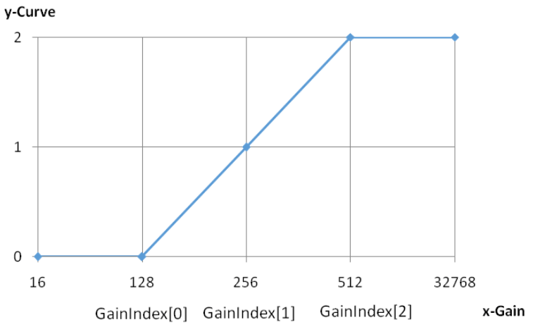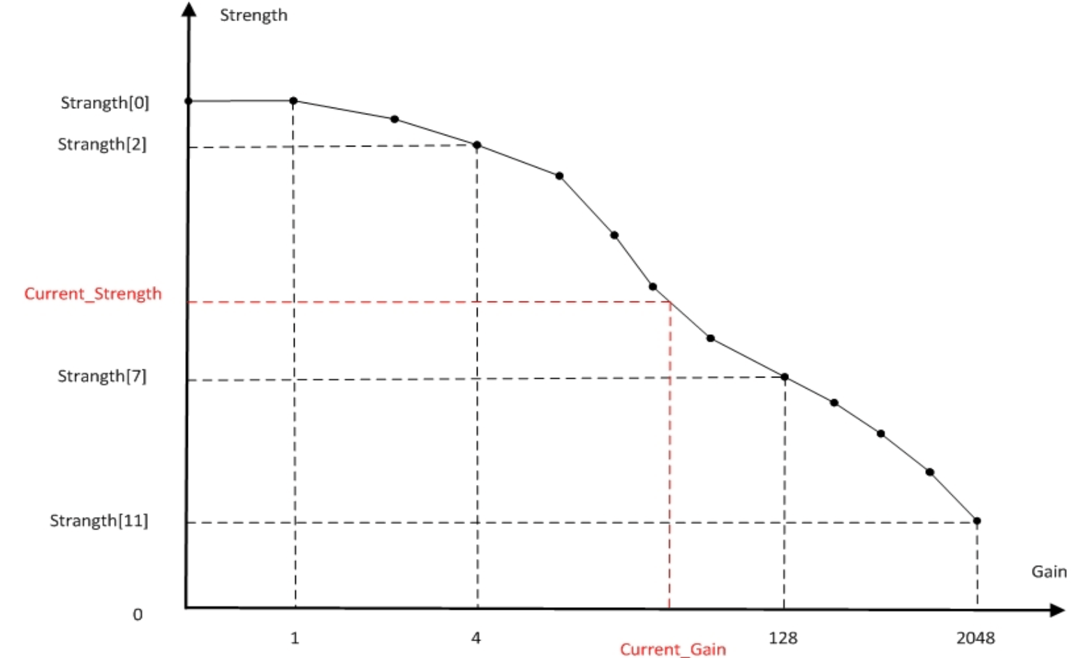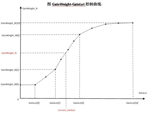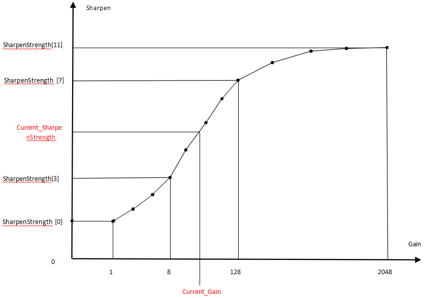 增益控制节点 N 从 0-11,共十二组,节点为 2 的 N 次方倍 gain,即第 0 档为 1 倍 gain;第 11 档为 2048 倍 gain.(见 Gain-Denoise_strength 示意图)