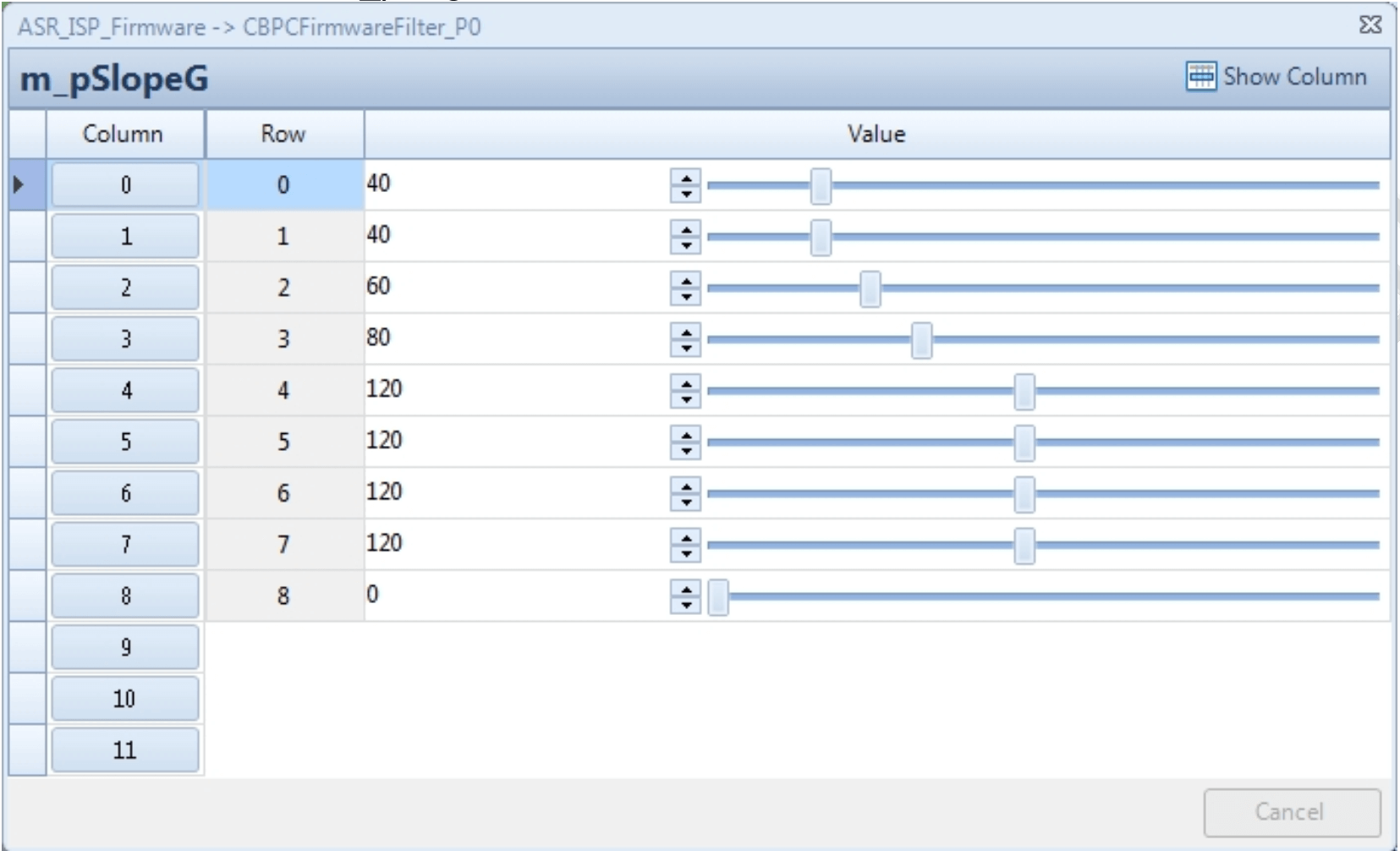 Column 表示 Gain 的档位,Column[0]表示 1 倍 gain 下对应的参数;Column[11]表示 2048 倍 gain 下对应的参数;