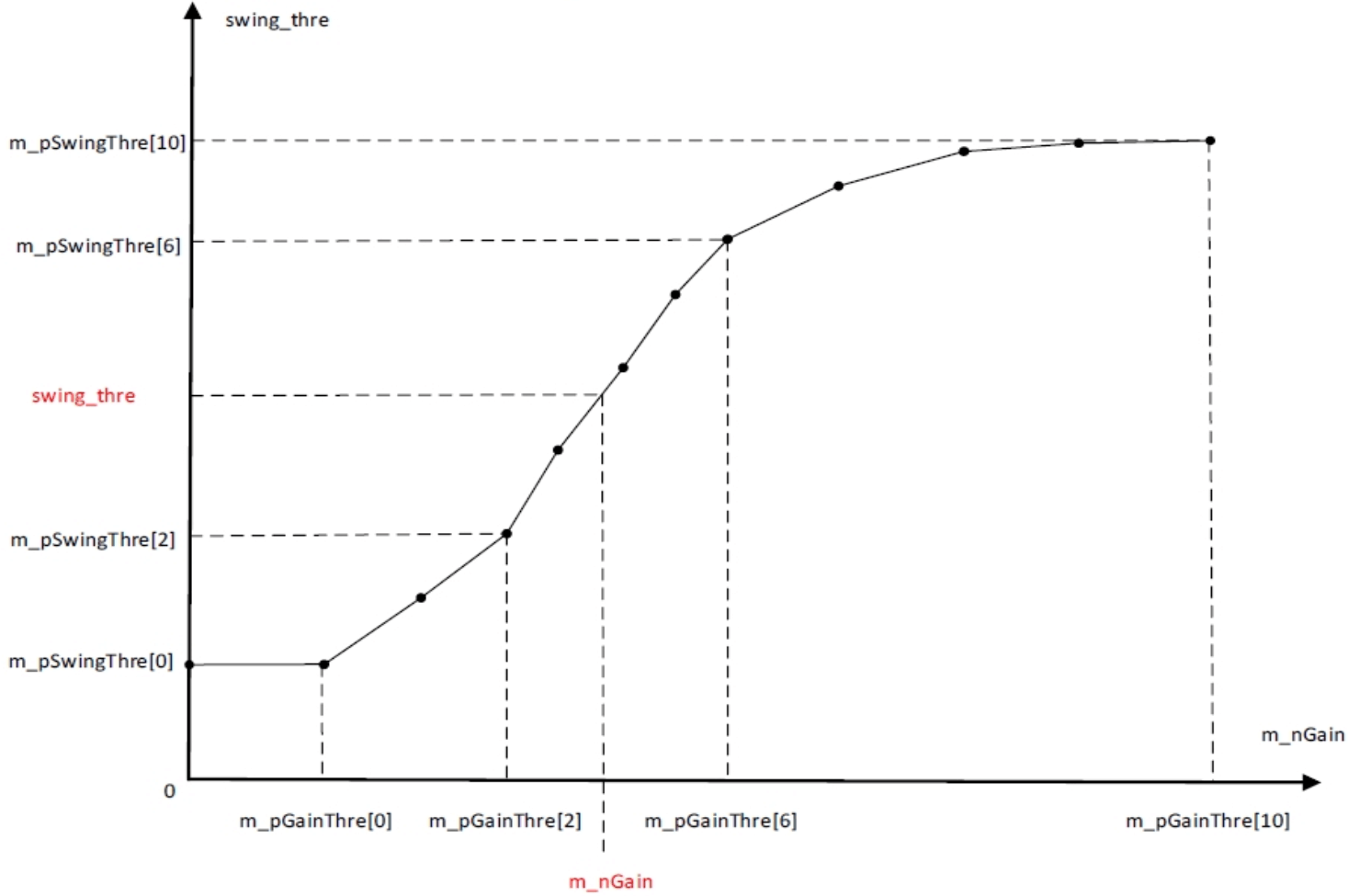 | m_pMaxSpacialDenoiseThreGain | 边缘去噪最大增强门限,最远距离所能达到的最大去噪强度(见Distance – RadialGain示意图) | 是 |