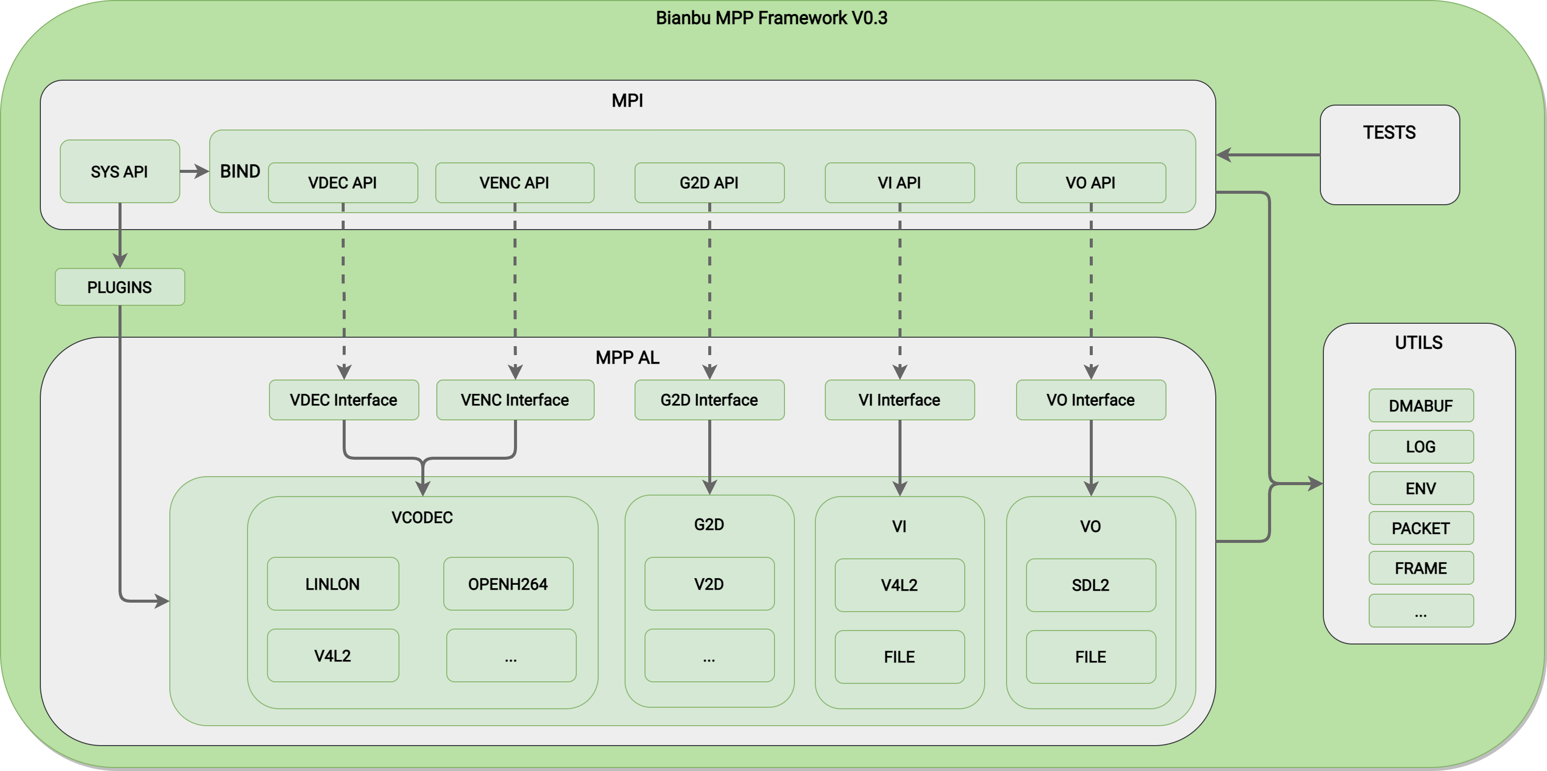 MPP (Multimedia Processing Platform) is part of the self-developed operating system Bianbu, aiming to encapsulate the usage differences of hardware encoding/decoding across multiple platforms and provide a unified API for developers.