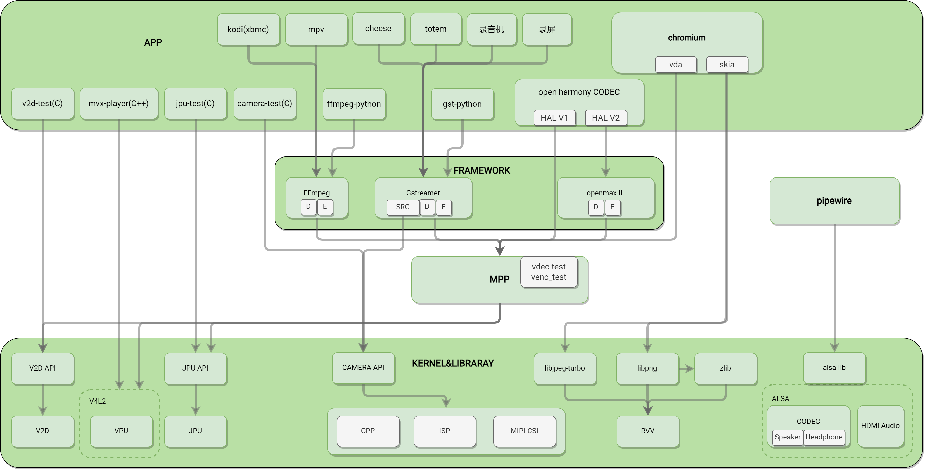 - Open Source Multimedia Framework Layer (FRAMEWORK): Commonly includes GStreamer and FFmpeg. GStreamer and FFmpeg are comprehensive multimedia solutions, including muxer/demuxer/decoder/encoder/display implementations, and can be used directly as open-source frameworks. In this layer, we have implemented multiple plugins to interface with the hardware encoding/decoding library via MPP.