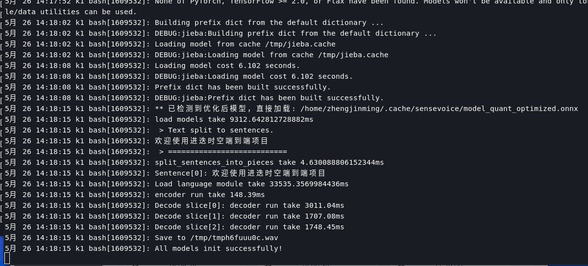 当日志显示 'All models init successfully!' 即表示 TTS 服务已启动,可以使用。