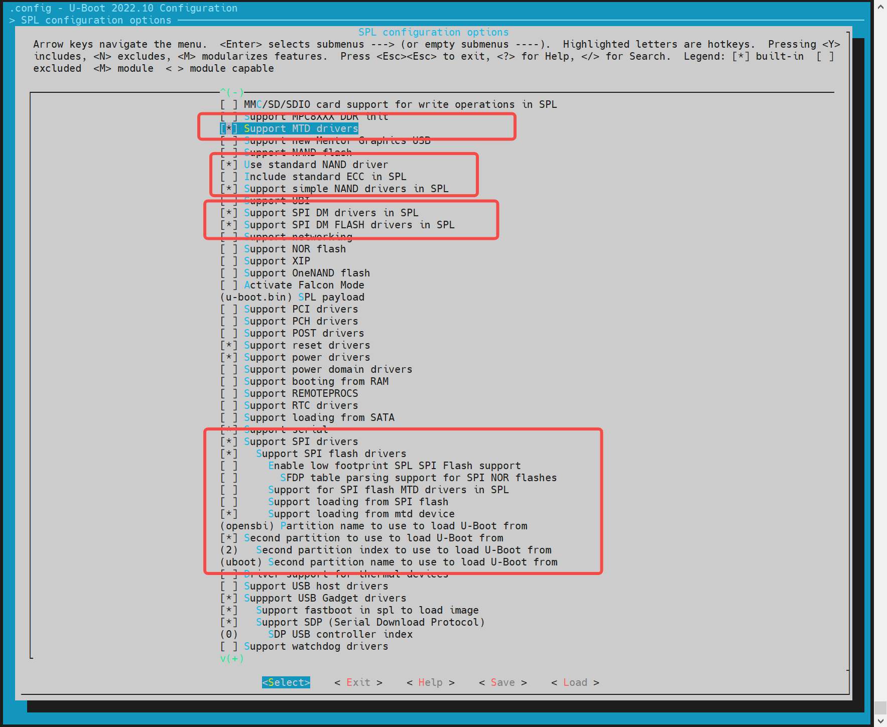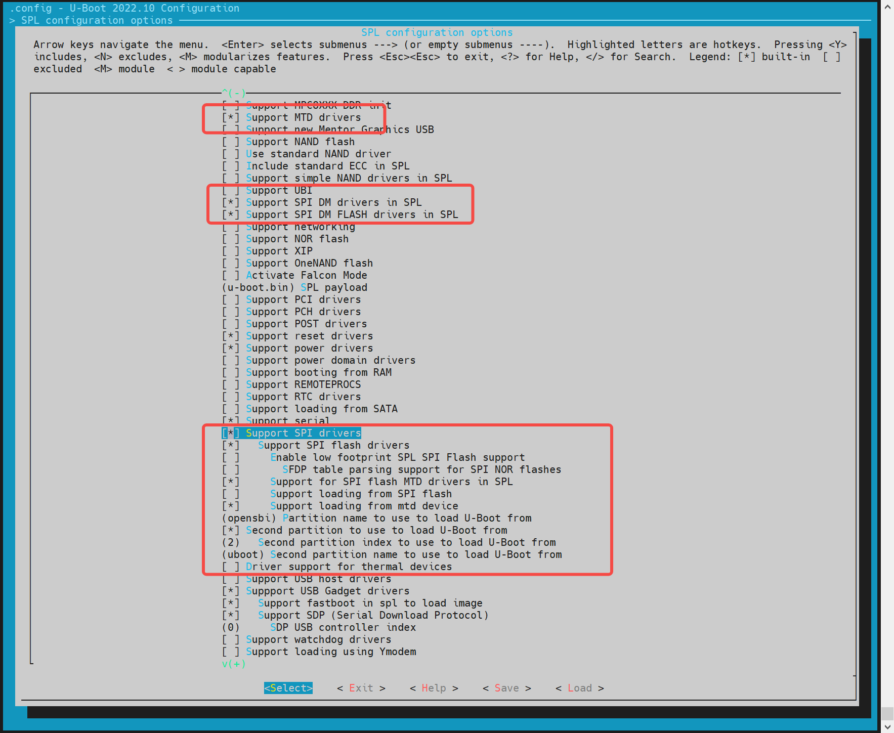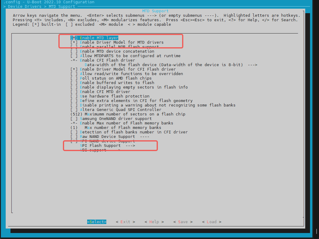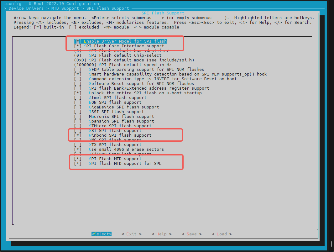 开启“Support MTD drivers”、“Support SPI DM drivers in SPL”、“Support SPI drivers”、“Support SPI flash drivers”、“Support for SPI flash MTD drivers in SPL”、“Support loading from mtd device”,