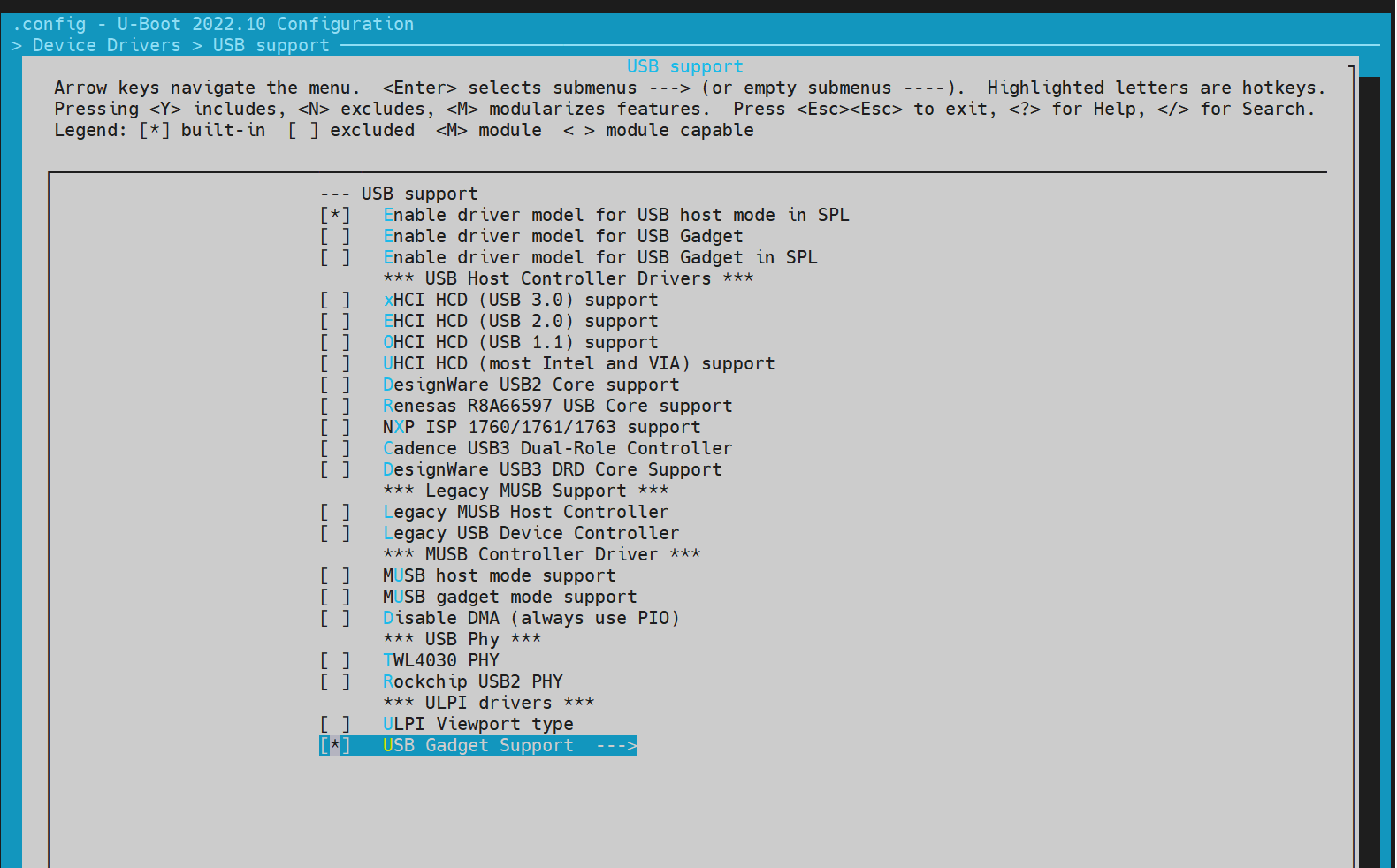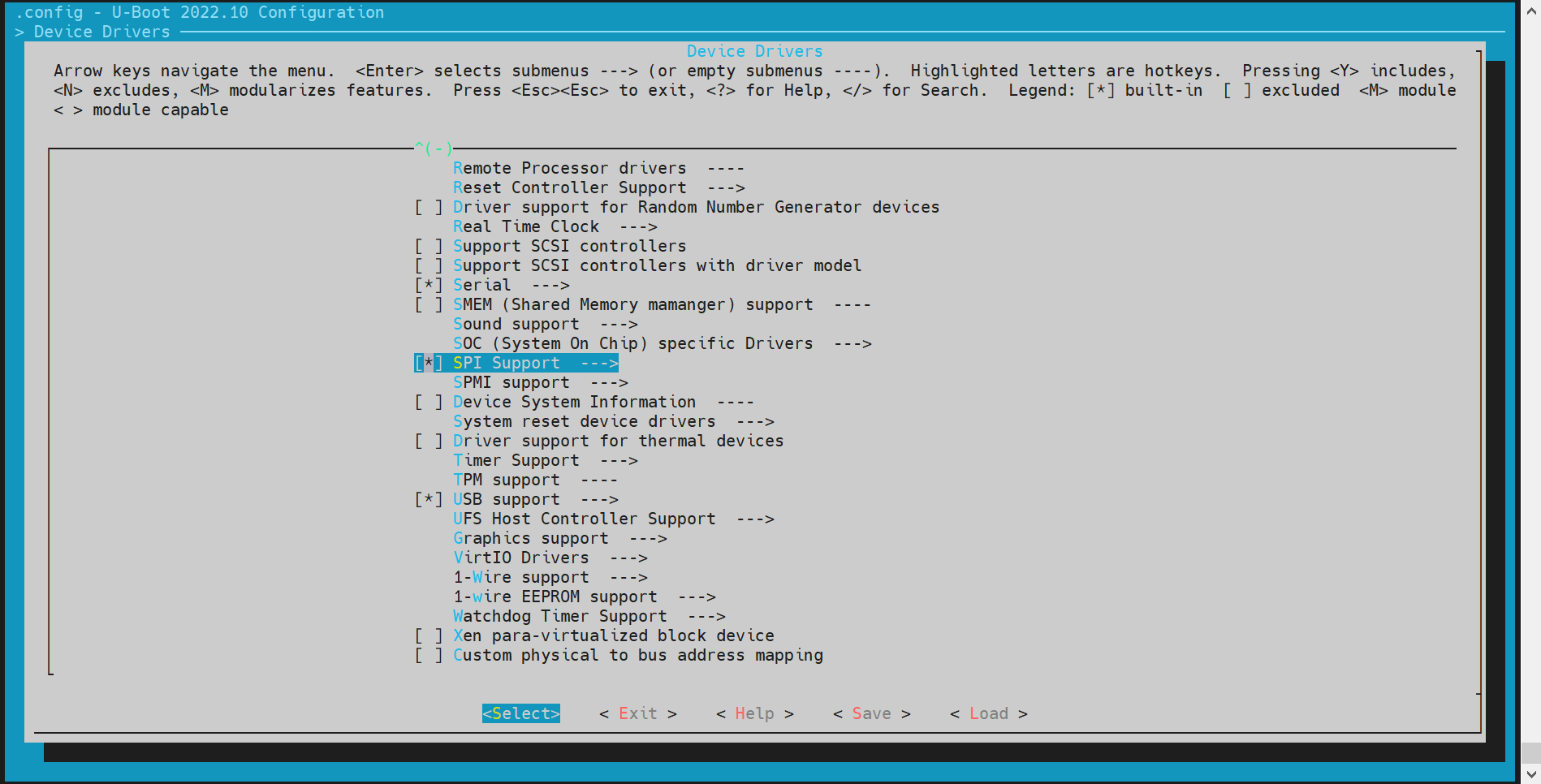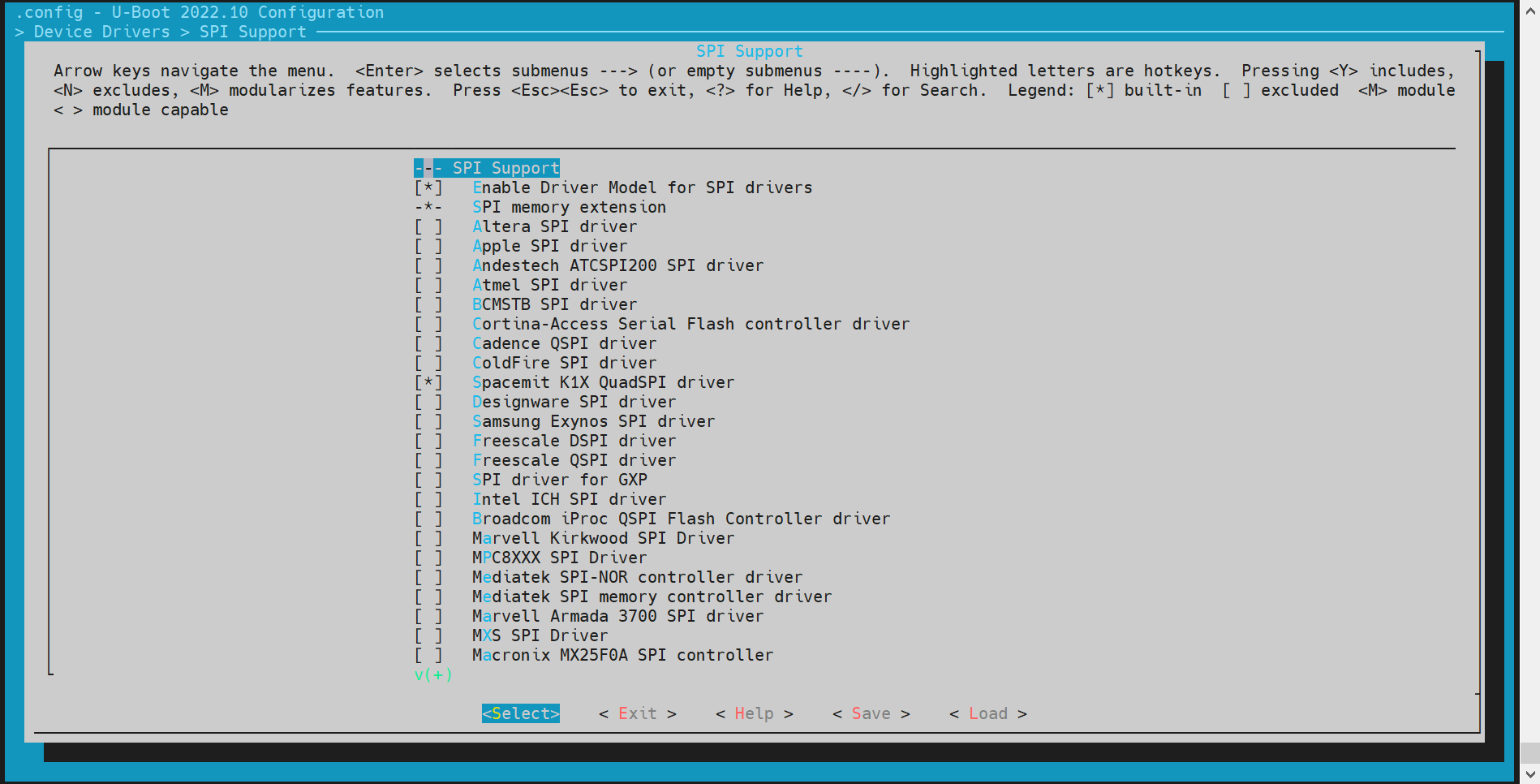 开启“Support MTD drivers”、“Support SPI DM drivers in SPL”、“Support SPI drivers”、“Support SPI flash drivers”、“Support for SPI flash MTD drivers in SPL”、“Support loading from mtd device”,