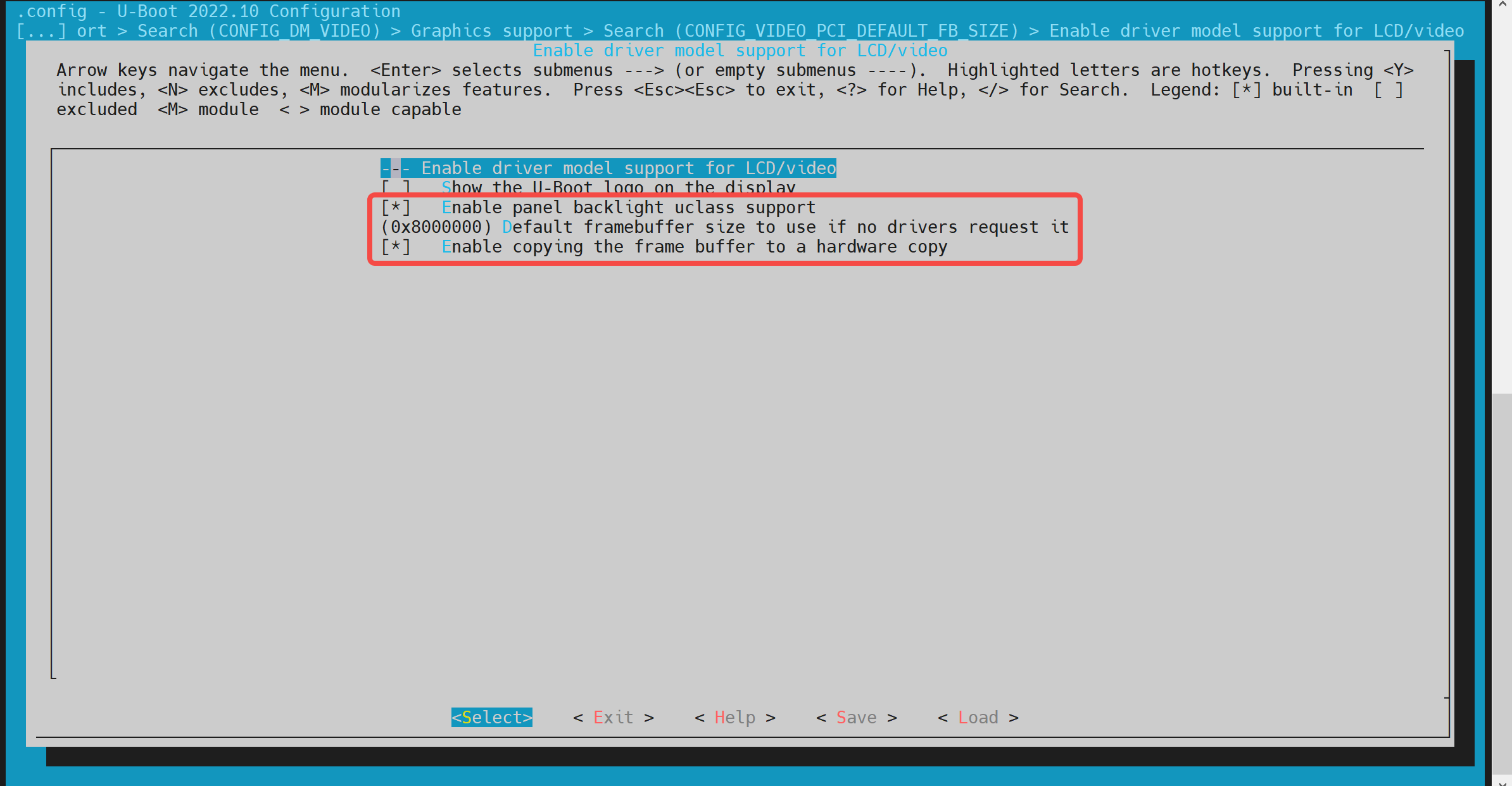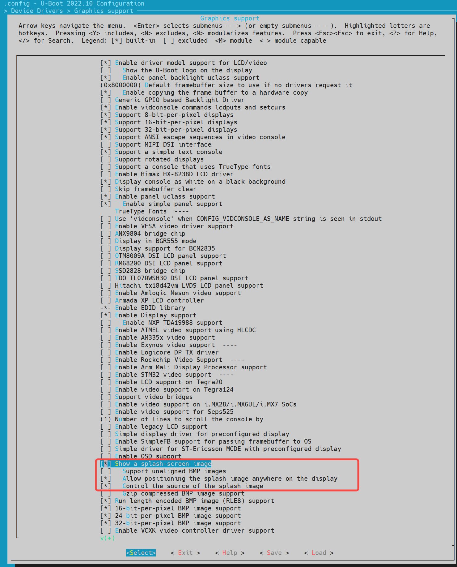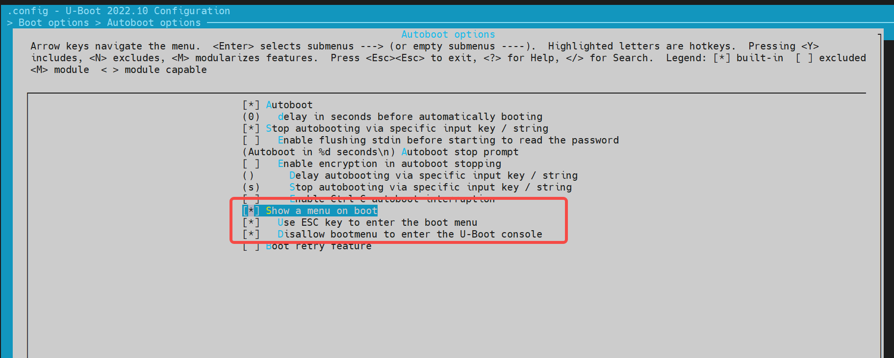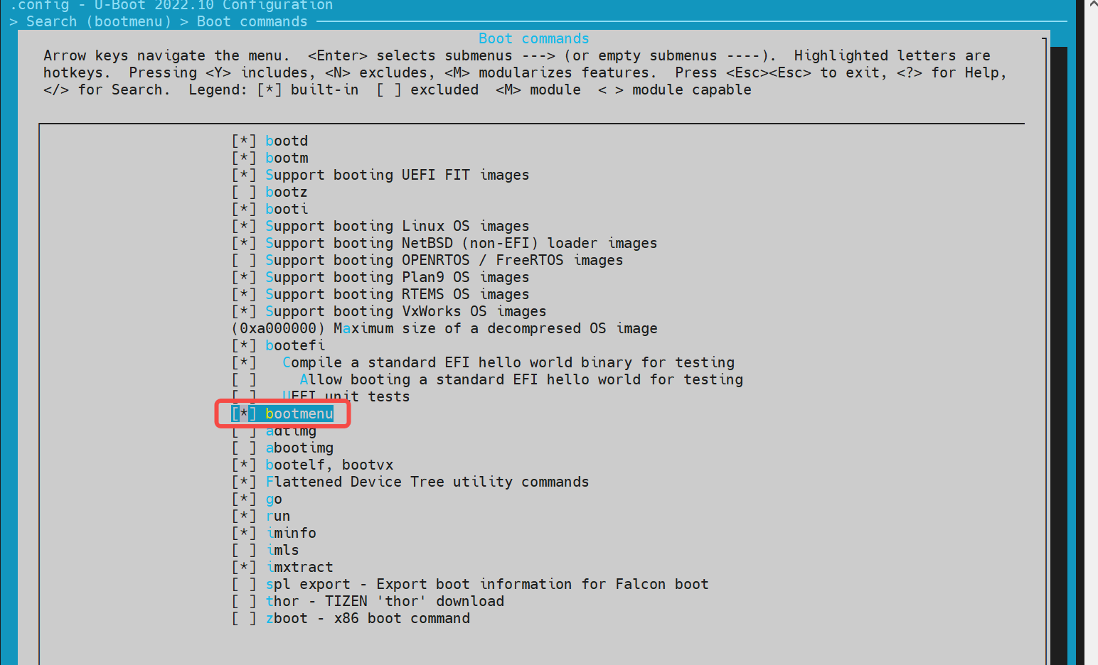 通过键盘"Y"/"N"以开启/关闭相关的功能配置。保存后会更新到 uboot 根目录的.config 文件。