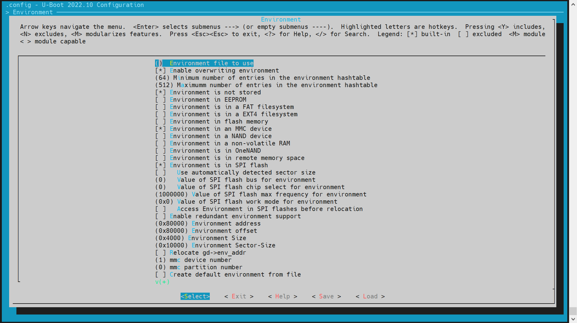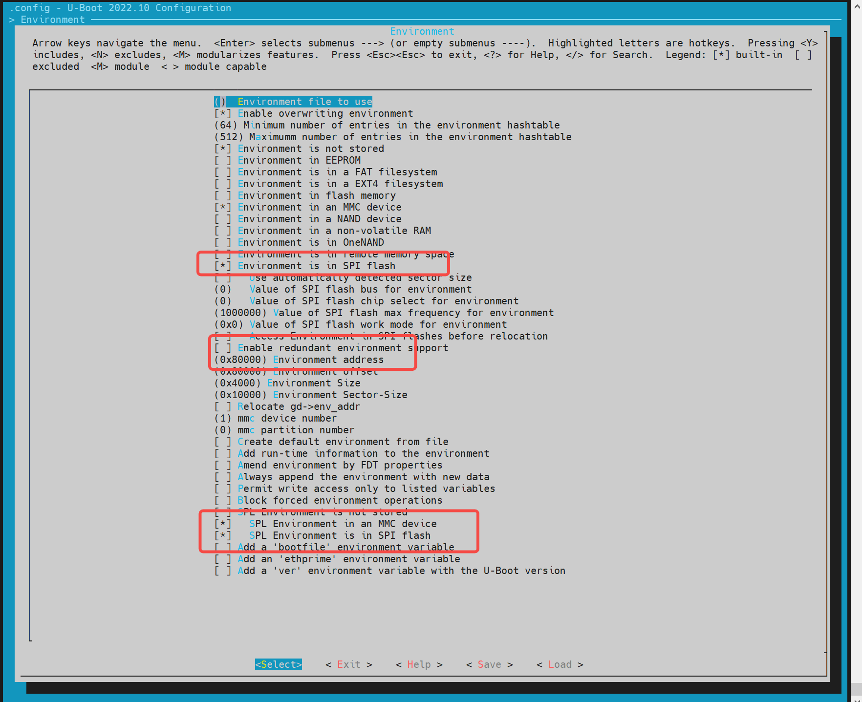 执行 make uboot_menuconfig,选择 Environment,选择开启 spi 的 env 加载。这里的 env 偏移地址需要与分区表的 env 分区保持一致,如 0x80000。
