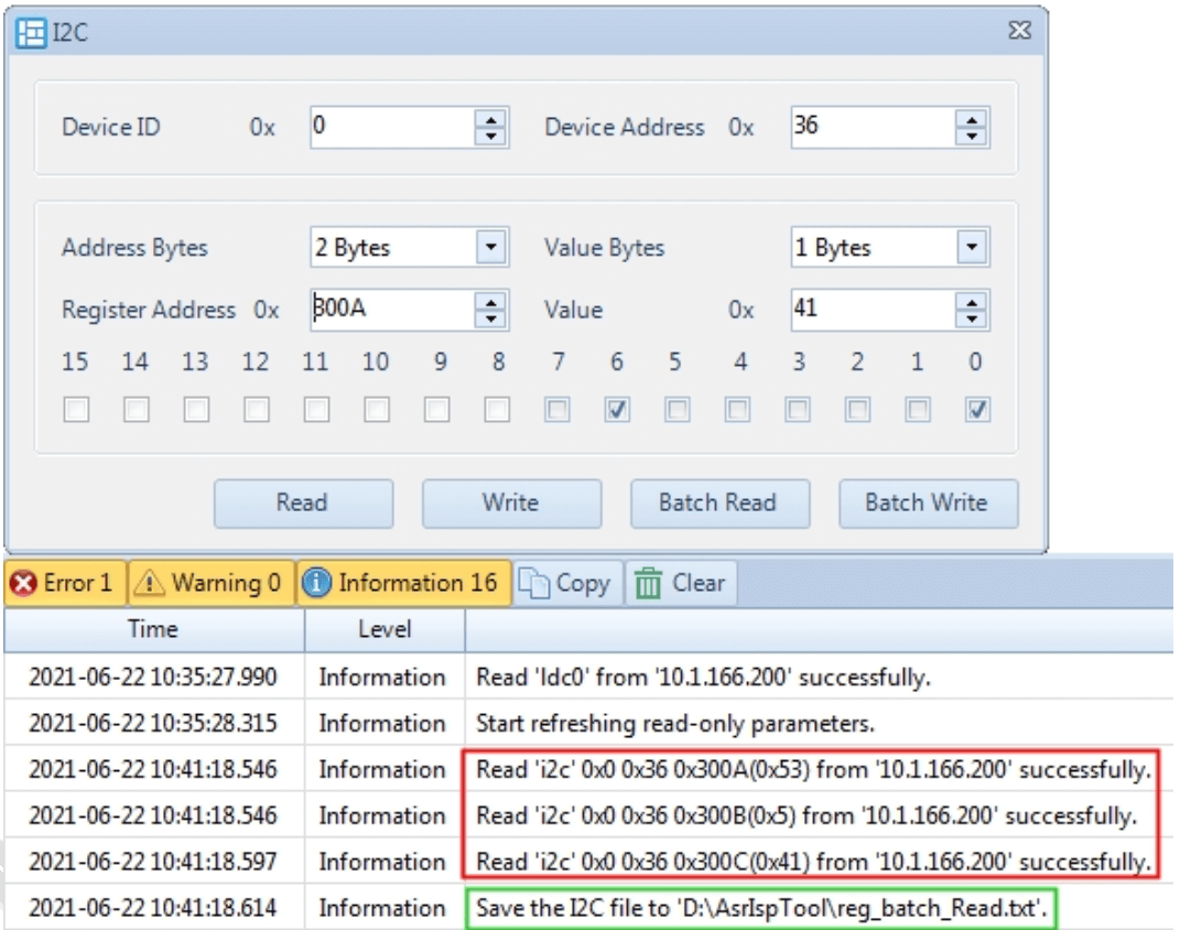 {Address, Value }, 批量读写寄存器点击 Batch Read / Batch Write 导入 reg_batch.txt。读取结果会在红色框中显示对应 log,同时会生成同名_read.txt 用于后续查看。
