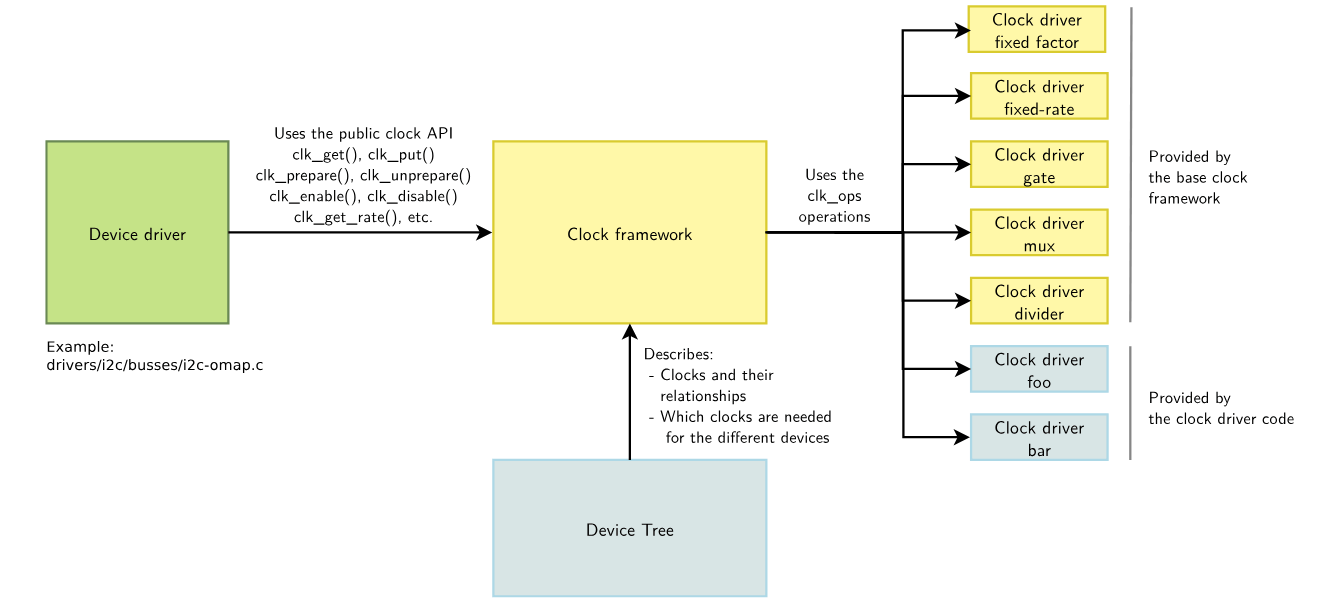 clock framework:CCF的核心部分,向clock consumers提供操作clock的通用API;实现时钟管理的核心逻辑,将与硬件相关的clock控制逻辑封装成操作函数集,交由clock provider实现。